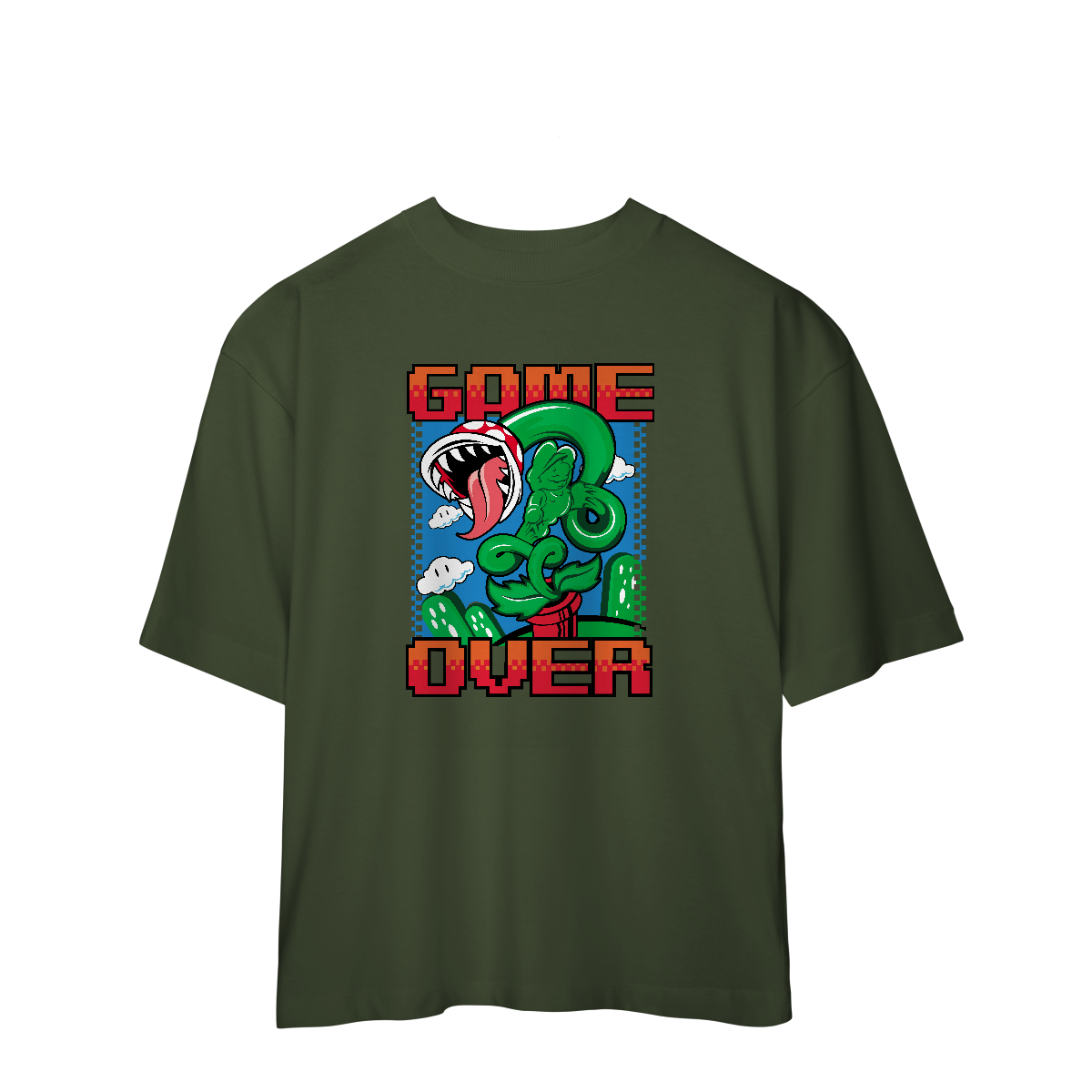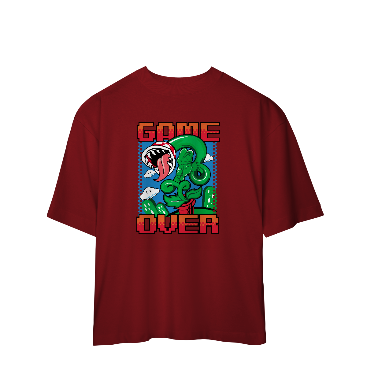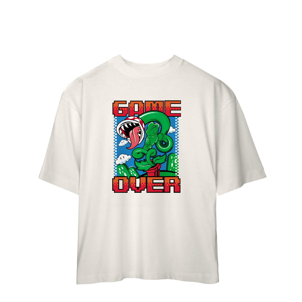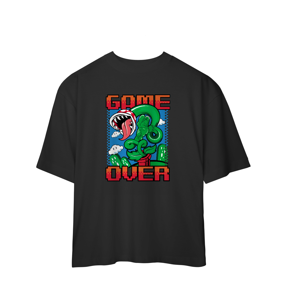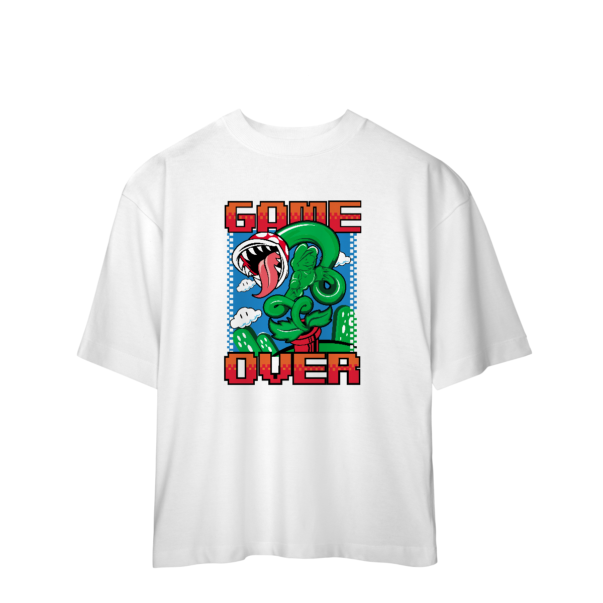 Essa camiseta oversized é pra quem já foi esmagado por tartaruga, caiu no buraco, tomou língua na cara e ainda respira (por pouco), é pra quem morreu 78 vezes na mesma fase e ainda xingou o controle.