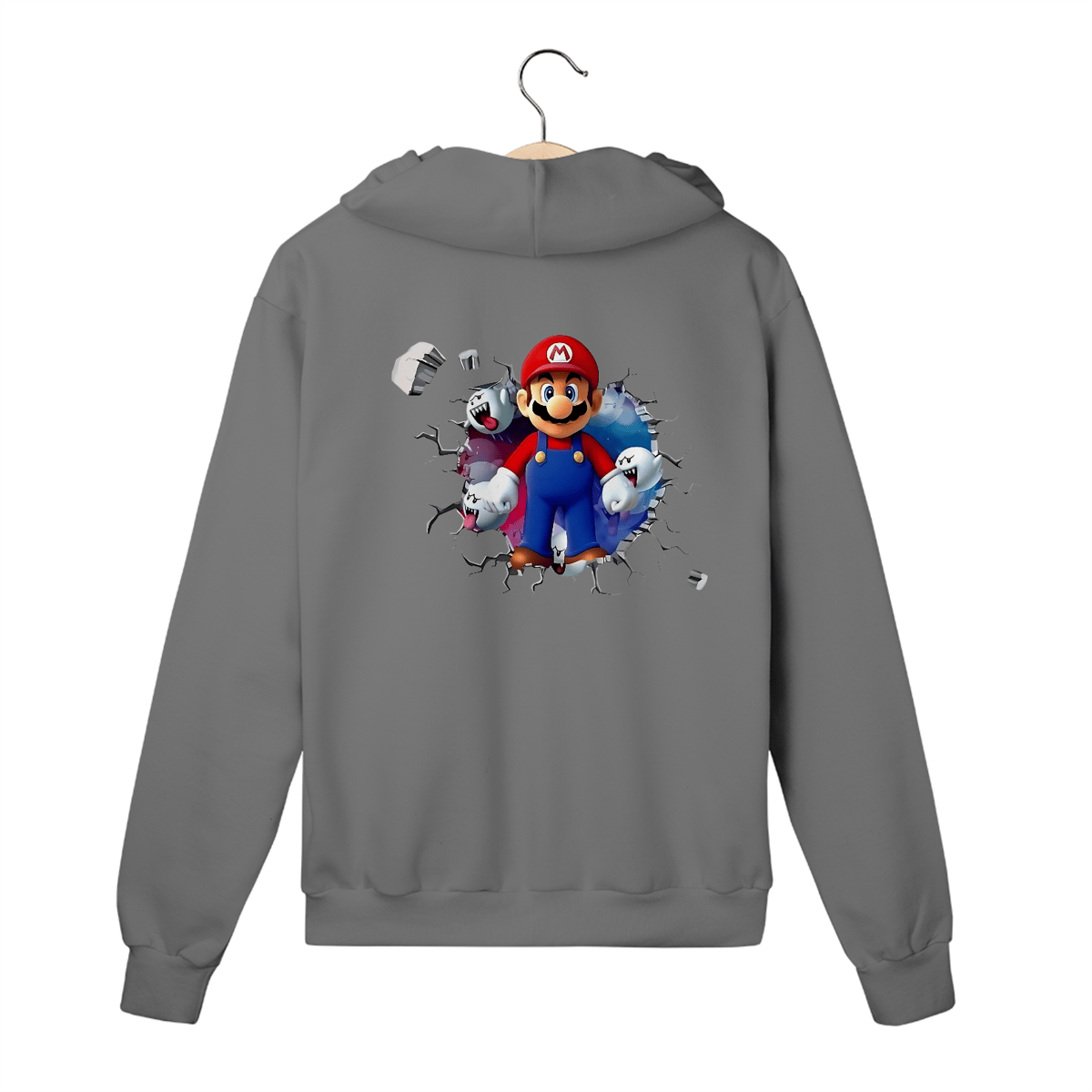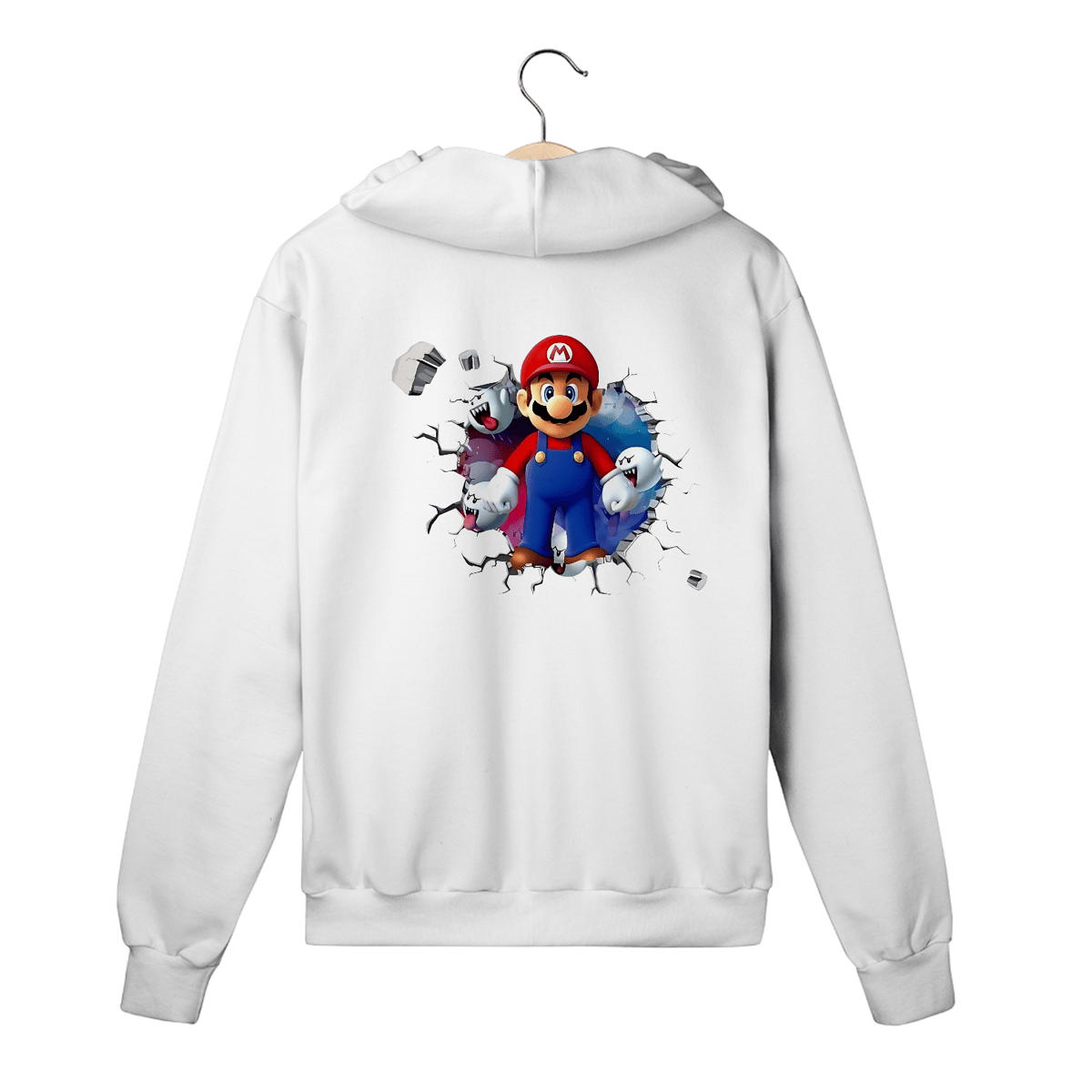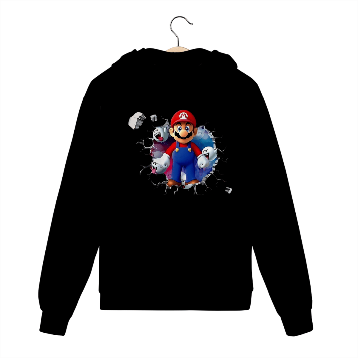 O clássico encontra o estilo urbano com o Moletom Premium com Zíper – Super Mario/Boo Saindo da parede. A estampa criativa simula uma parede quebrada de onde o lendário Mario e os fantasmas Boo saem de lá.