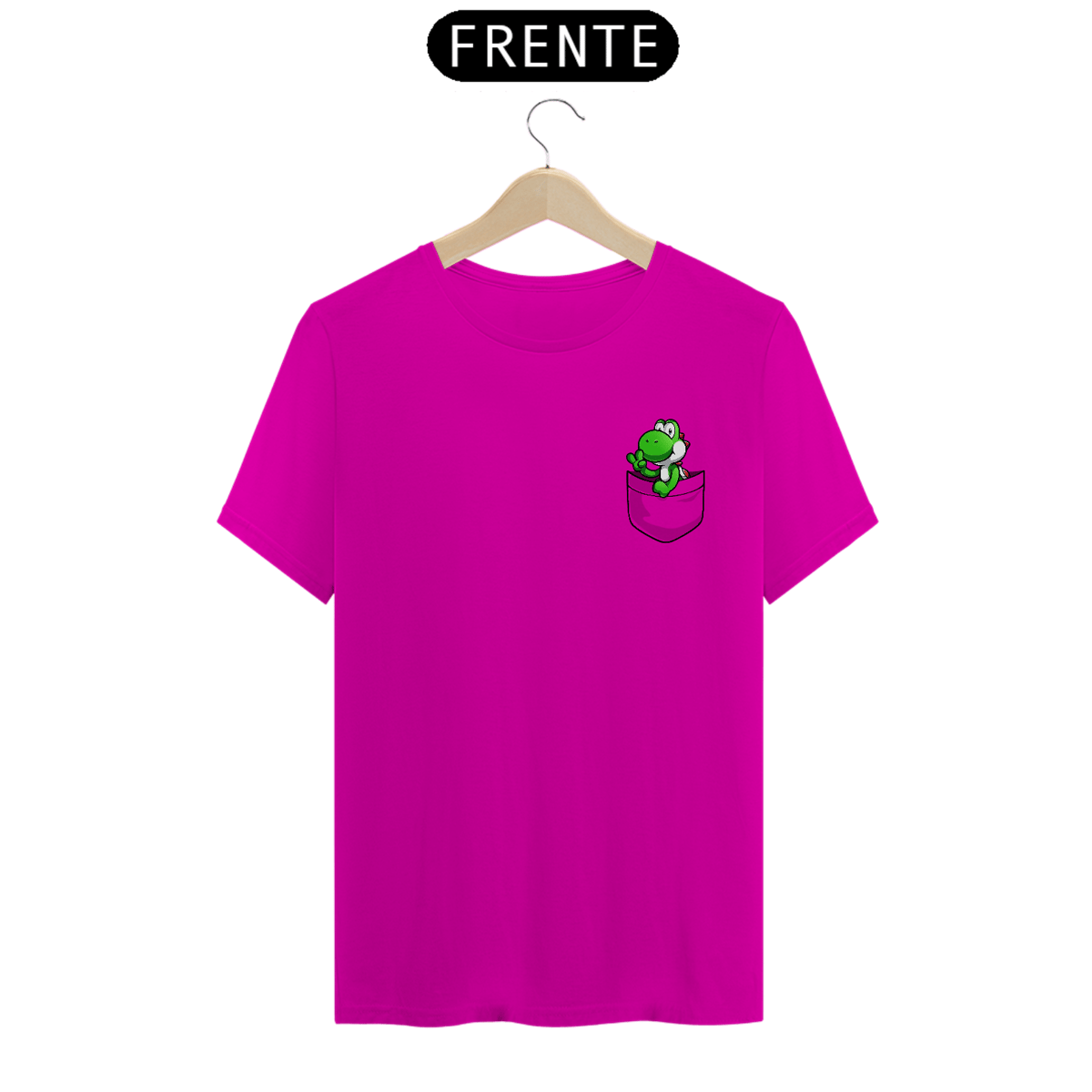 Na Camiseta Quality Yoshi no Bolso, ele aparece saindo de um bolso fake estampado no peito, pronto pra embarcar com você em qualquer aventura do dia a dia.