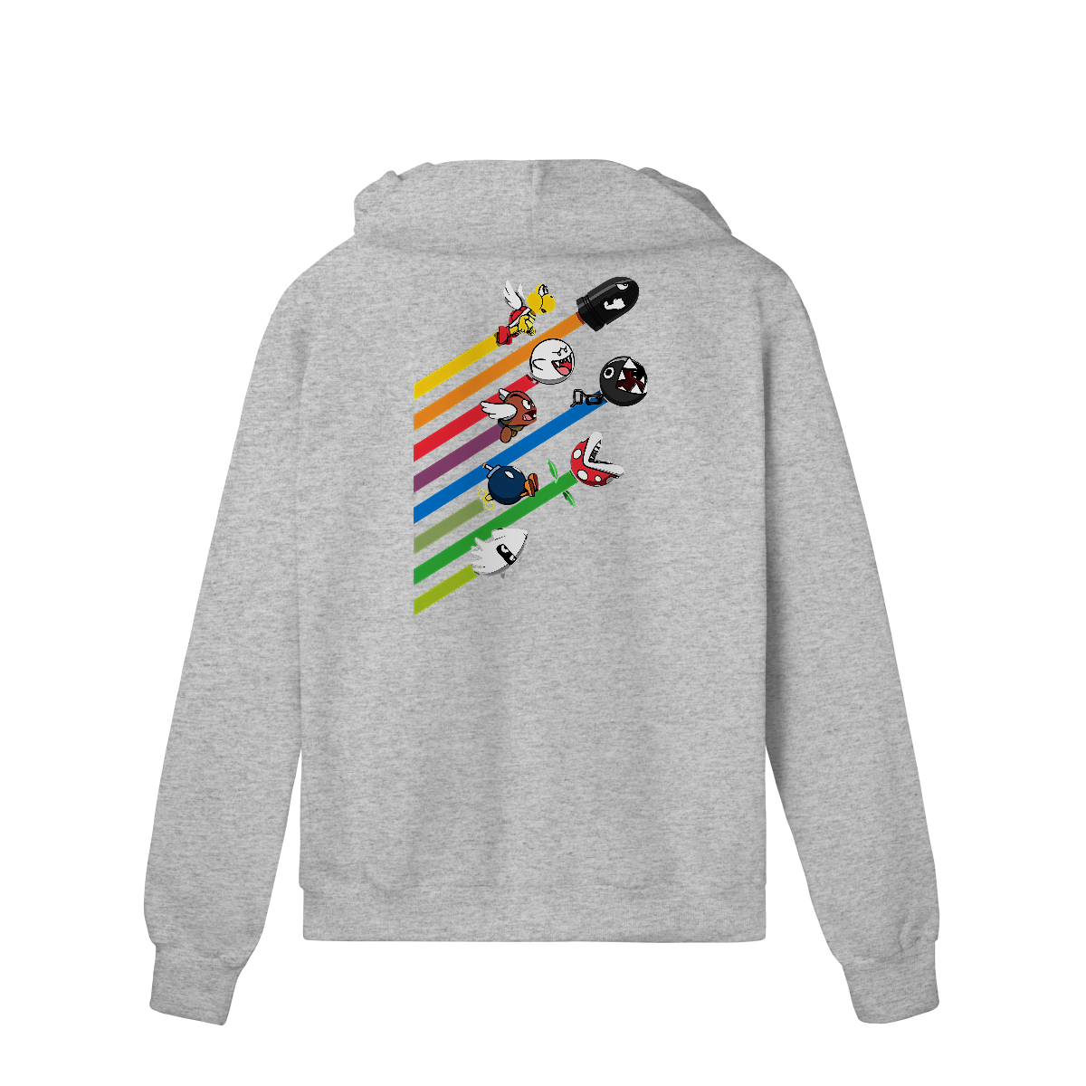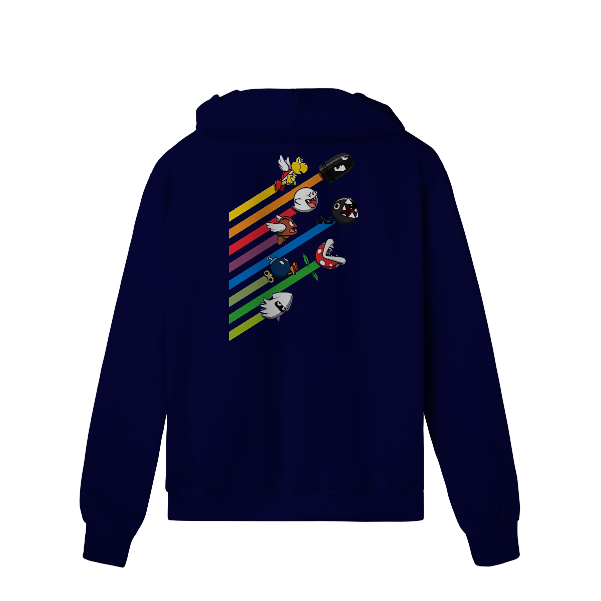 Se os heróis descansam, os vilões correm — e na estampa do Moletom Premium Corrida dos Vilões, eles fazem isso em grande estilo! Bullet Bill, Boo, Goomba, Chain Chomp, Planta Piranha, Bob-omb e outros clássicos do universo Mario disparam em uma corrida insana sobre faixas coloridas, como se tivessem saído direto de um crossover entre game retrô e passarela pop.