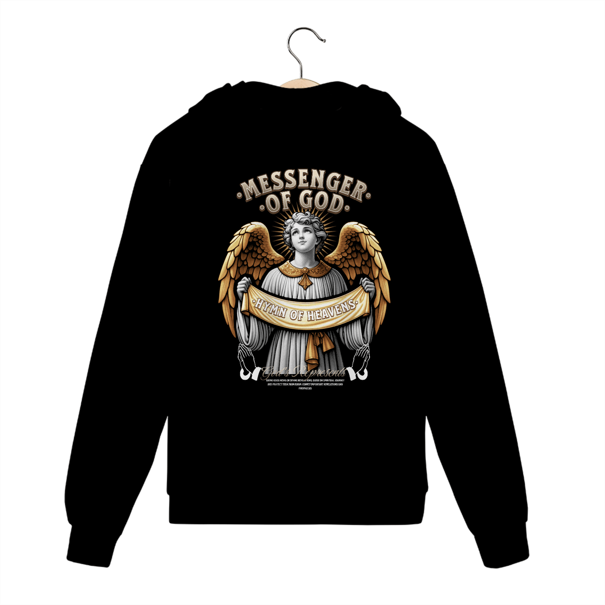 Chegou a peça que mistura arte celestial e estilo insano! Esse moletom traz a imagem impactante de um anjo dourado, o verdadeiro Mensageiro de Deus, carregando o estandarte dos céus: “Hymn of Heavens”.